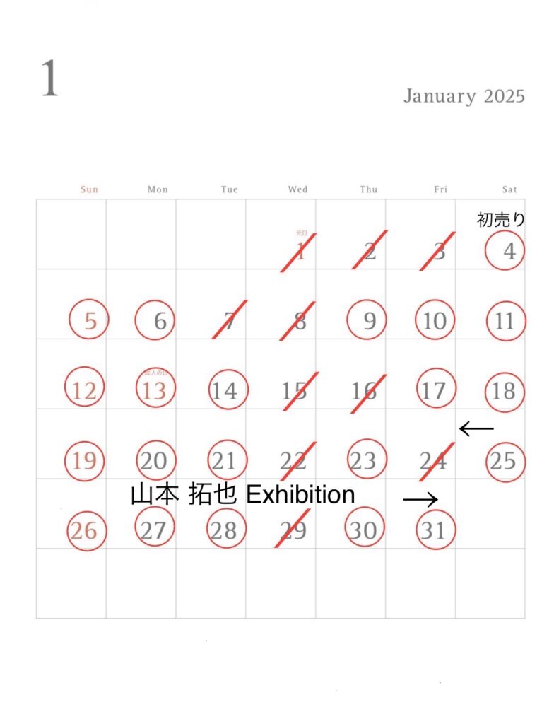 1月営業日 2025.1.1 2025年1月の営業日です。 今年も、素敵な作家様の作品の展示会・販売を予定しています。 1月25日からは、山本拓也さんのミニ個展を開催予定です。 人と人との出逢いが『一期一会』であるようにモノとの出逢いや、その日の出来事は一生に一度しかありません。皆様のかけがえのない毎日を彩る、素敵なモノとの出逢いのお手伝い、そして一緒に喜びを分かち合えたらと思ってます。2025年もPour toi共々よろしくお願いいたします。 ブランド・作家一覧に戻る おしらせ一覧に戻る