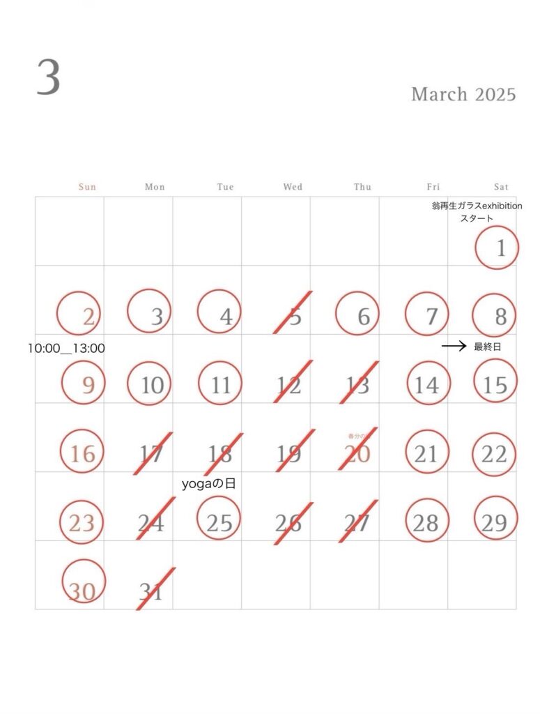 3月の営業日 2025.3.1 3/1日〜15日 翁再生ガラス工房 exhibition 3/9は、都合により10:00〜13:00までの営業時間となります。 3/25日は、Pour toi アトリエにてヨガの開催日です。 3月も皆さまにお会い出来る事を、楽しみにご来店お待ちしております。 ブランド・作家一覧に戻る おしらせ一覧に戻る